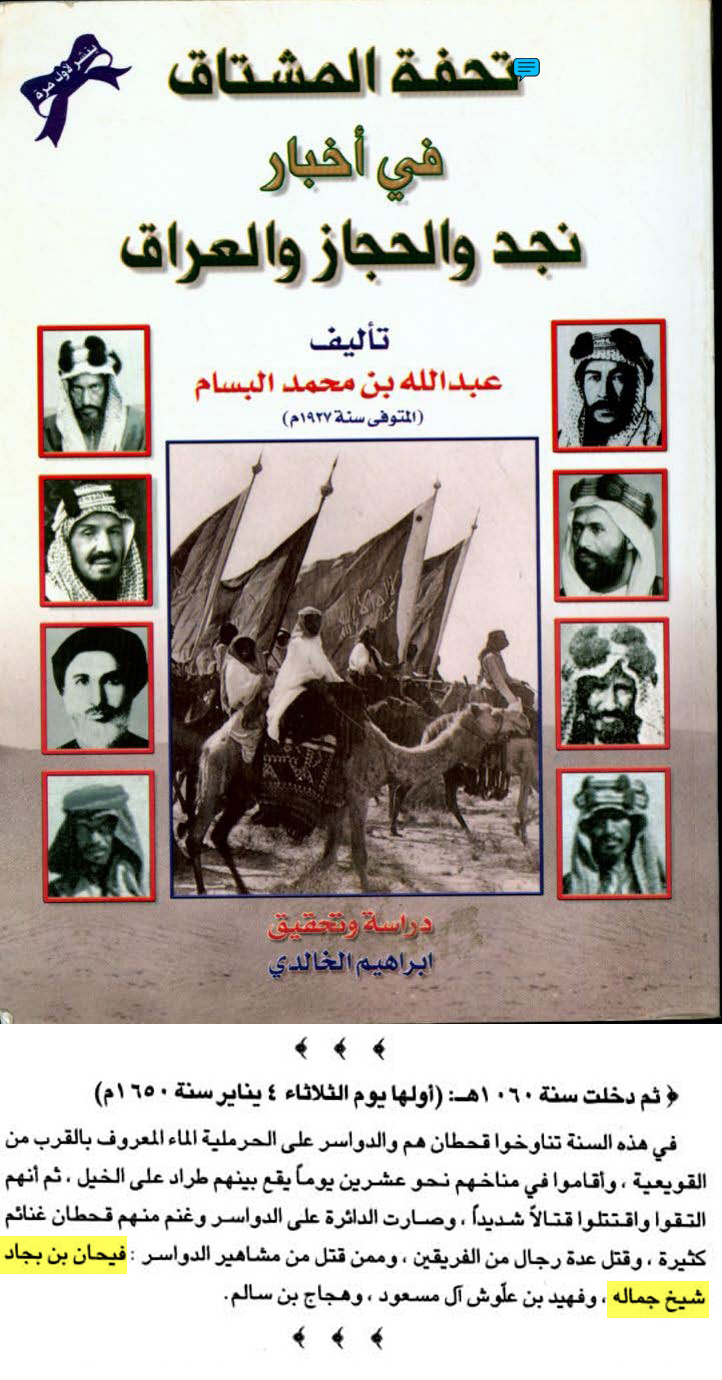 البسام .عبدالله. (2000م).تحفة المشتاق في اخبار نجد والحجاز والعراق. ط1.دراسة وتحقيق إبراهيم الخالدي. ص121